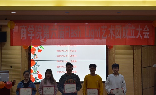10月23日晚,商学院第六届Flash Light艺术团成立大会于十教北102隆重举行。莅临本次大会的嘉宾有商学院关工委杨大媛老师、院学工组常徕老师、孙君镕老师、李玲孜老师、杨日映老师、杨乔清老师。应邀出席会议的还有商学院团委学生会代表、各兄弟学院艺术团团长、艺术团的全体成员以及商学院学生代表。