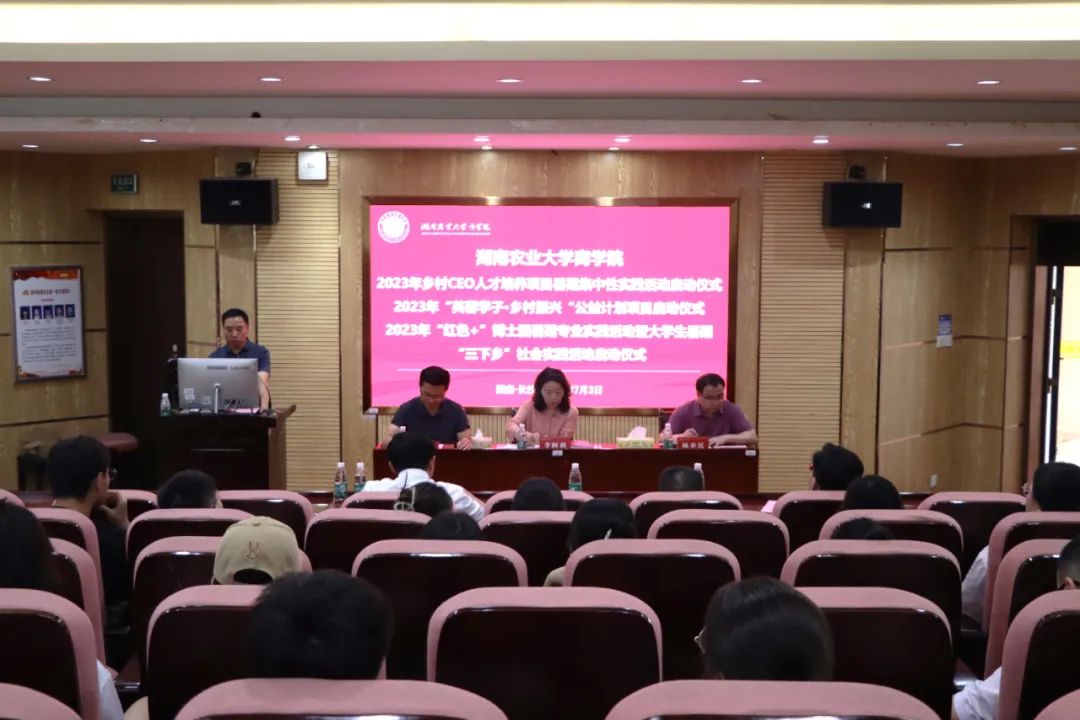 7月3日,商学院2023年乡村CEO人才培养项目暑期集中性实践活动、2023年“芙蓉学子·乡村振兴”公益计划项目、2023年“红色+”博士团暑期专业实践活动暨大学生暑期“三下乡”社会实践活动启动仪式在十教北102举行。湖南中惠农科技集团有限公司总经理梁滋民,商学院党委书记李阿利、院长杨亦民等学院领导出席本次会议,各系主任、学工组老师及各暑期社会实践团队成员参加会议。会议由商学院副院长莫鸣主持。