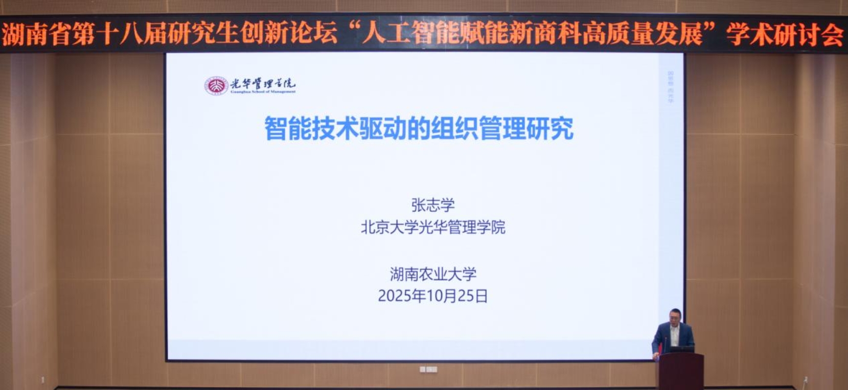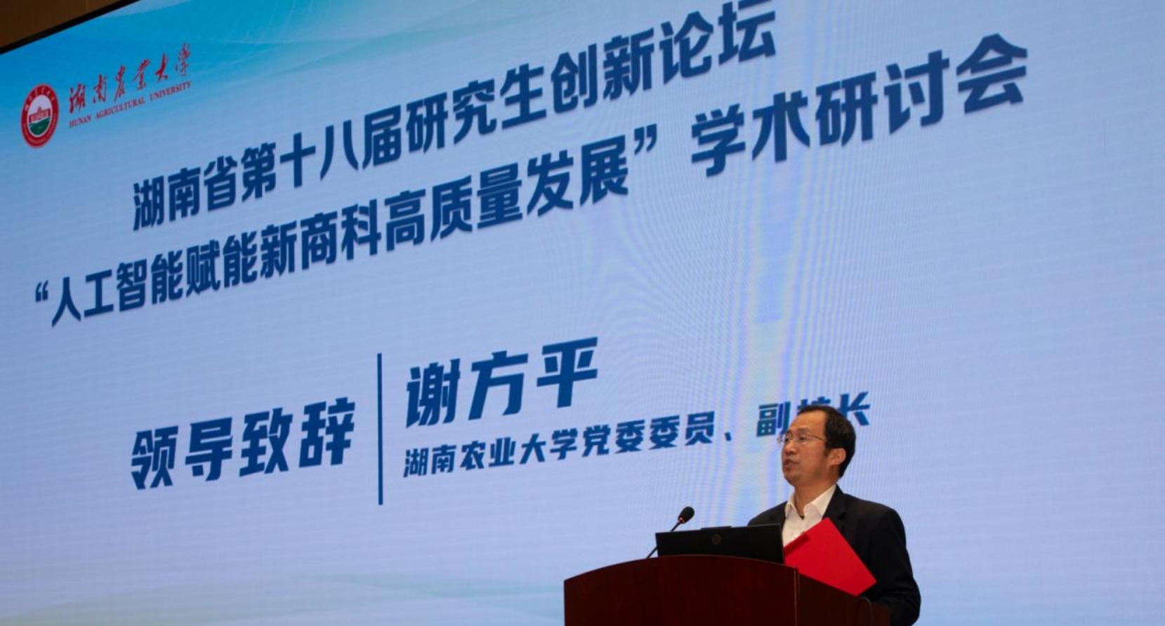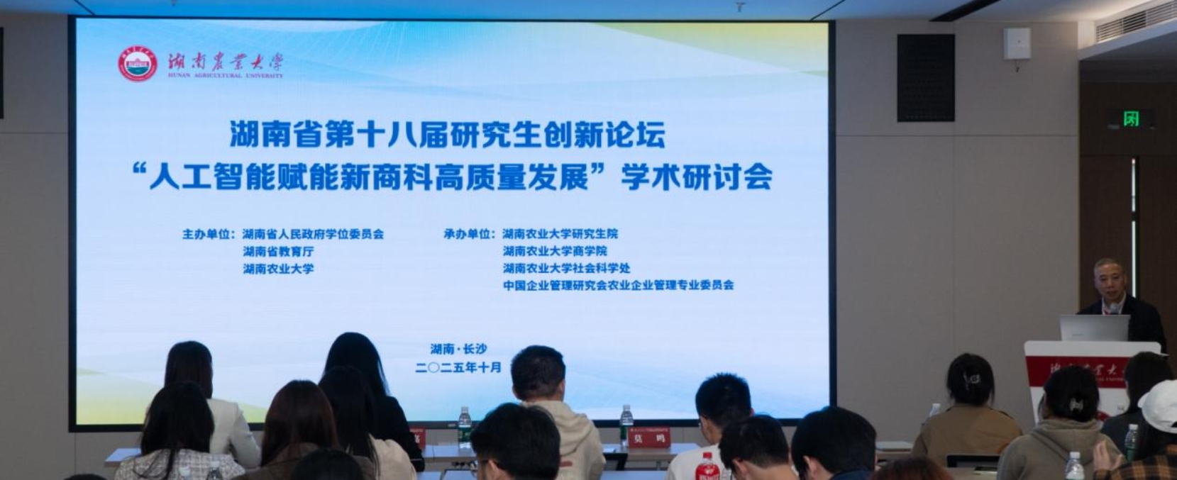 本网讯(李文涛 左声亮)10月25日,湖南省第十八届研究生创新论坛“人工智能赋能新商科高质量发展”学术研讨会在湖南农业大学岳麓山实验室4号楼102会议厅隆重举行。本次论坛由湖南省人民政府学位委员会、湖南省教育厅、湖南农业大学主办,湖南农业大学研究生院、湖南农业大学商学院、湖南农业大学社会科学处、中国企业管理研究会农业企业管理专业委员会联合承办。会议由湖南农业大学商学院党委书记莫华主持。来自北京大学、浙江财经大学、浙江工业大学、中南大学、湖南大学等省内外高校和科研院所的300余名师生齐聚一堂,共同围绕“人工智能实践与新商科教育创新、数智时代新商科专业重塑与人才培养”等前沿议题展开研讨。
