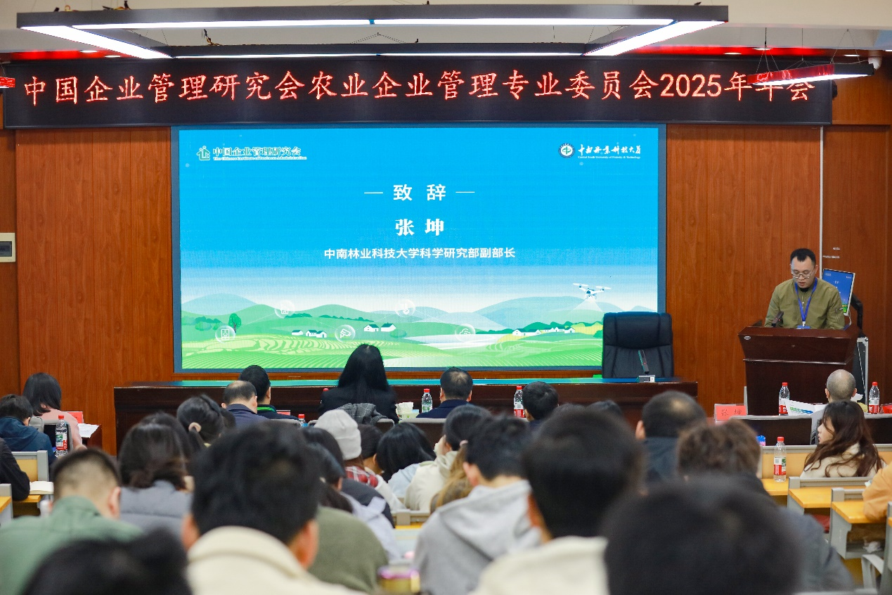 (商学院 肖时松)12月20日上午,中国企业管理研究会农业企业管理专业委员会2025年年会暨研讨会在长沙顺利举办。本次会议由中南林业大学和湖南农业大学共同承办,来自全国十余所高校及科研单位的数十位专家学者齐聚一堂,围绕“助力乡村全面振兴、乡村商科人才培养”前沿议题,展开了深入的分享与交流。中南林业科技大学科学研究部副部长张坤,农业企业管理专业委员会主任、湖南农业大学商学院院长杨亦民分别致辞,中南林业科技大学经济管理学院党委书记方威主持开幕式。
