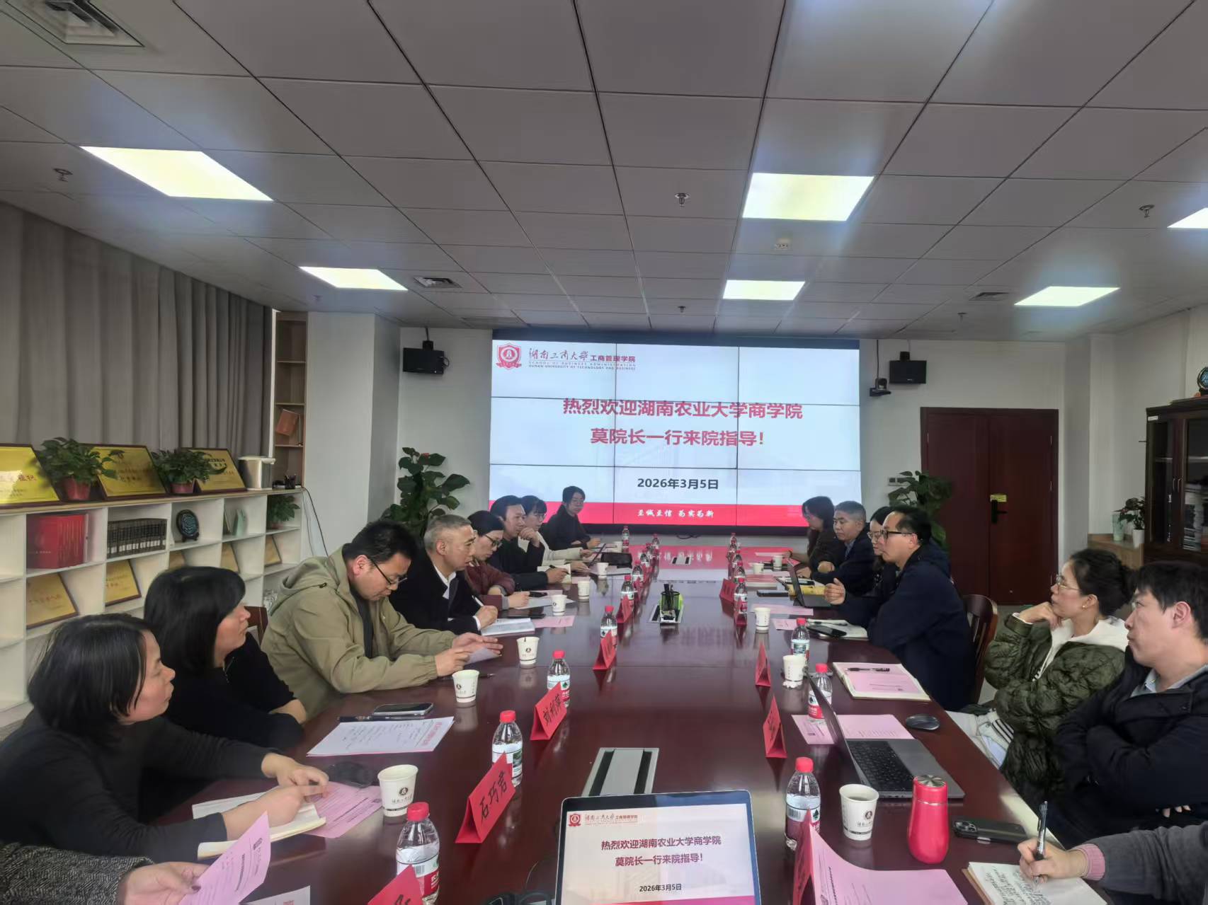本网讯(商学院 李湘新)为做好2026版本科专业人才培养方案修订工作,进一步提升人才培养质量,3月5日下午,副院长莫鸣带领工商管理系和市场营销系骨干教师赴湖南工商大学工商管理学院开展调研交流。会议在湖南工商大学湘江楼A714会议室举行,双方围绕人才培养模式创新、专业建设、教学管理等内容进行深入研讨。