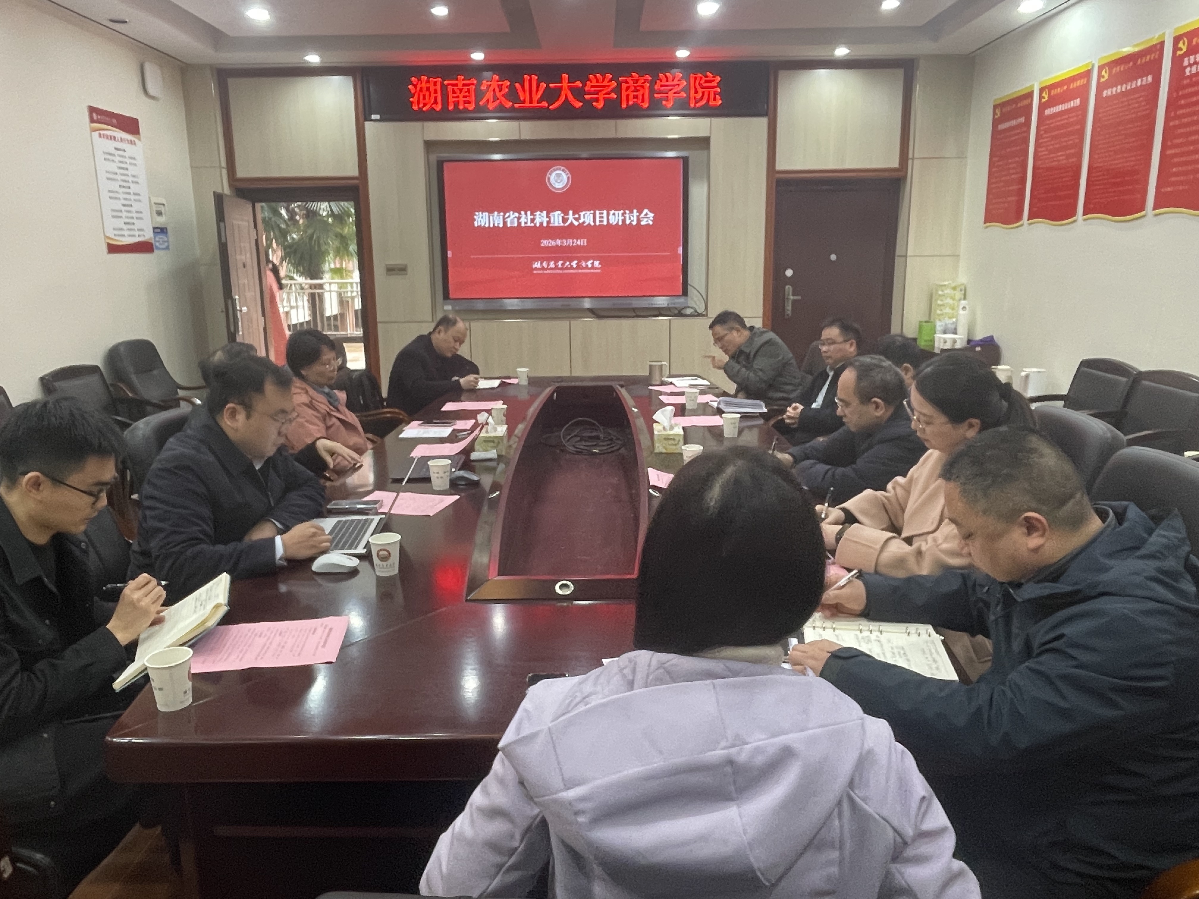 本网讯(商学院 翦润芳)为完成省社科重大项目研究团队组建及任务落实,学院于3月24日召开湖南省社科重大项目研讨会。研讨会由院长杨亦民主持,组织部常务副部长伍小松、社科处处长匡远配、副处长肖潇、学院党委书记莫华、副院长唐文源、国家社科重大项目首席专家罗光强以及研究团队成员等参会。