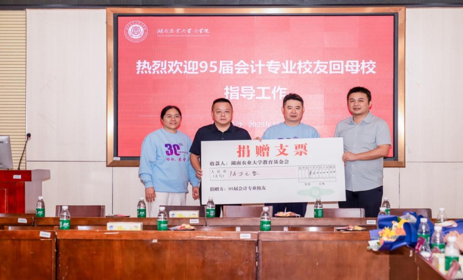 本次活动加深了同窗情谊,促成了多项校企合作契机,并正式成立 “95届会计专业校友助学金”。正如会场横幅所书“从湘农出发,与国同‘账’三十年”,这群以专业力量推动中国会计行业发展的湘农人,正用实际行动反哺母校,续写着与湘农命运相连、休戚与共的新篇章。